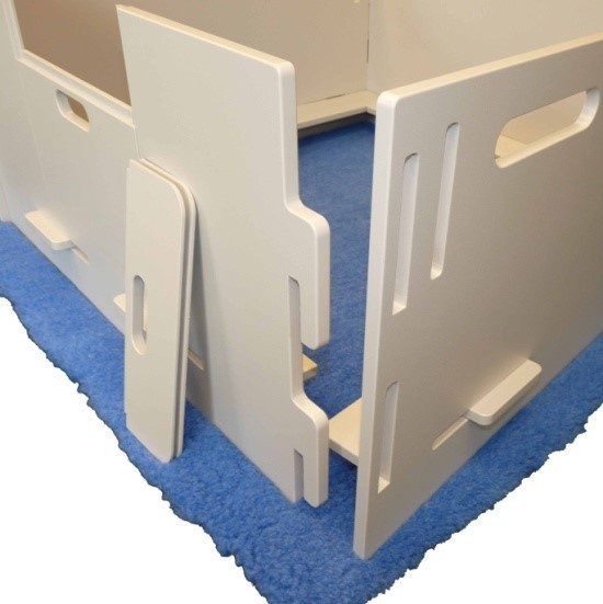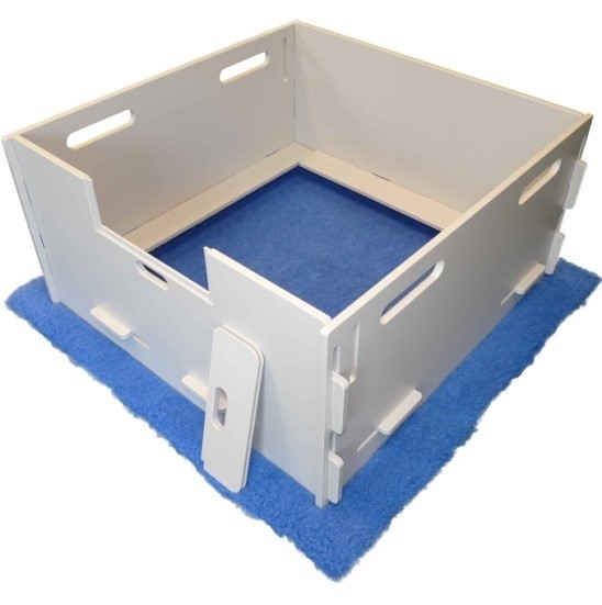 Simply align, insert, and slide into position the unique hook and slot joints in the corners and the puppy rails. Puppy rails are self supporting so there are no legs or supports to trap and endanger puppies. MagnaBox whelping box can be used without the puppy rails however the puppy rails cannot be removed without disassembling the whelping box. Once assembled, the MagnaBox whelping box can be lifted as an assembly and moved for cleaning or relocation.The MagnaBox whelping box has a 'no bottom' design which allows for your choice of whelping pads, heaters or alternate flooring.